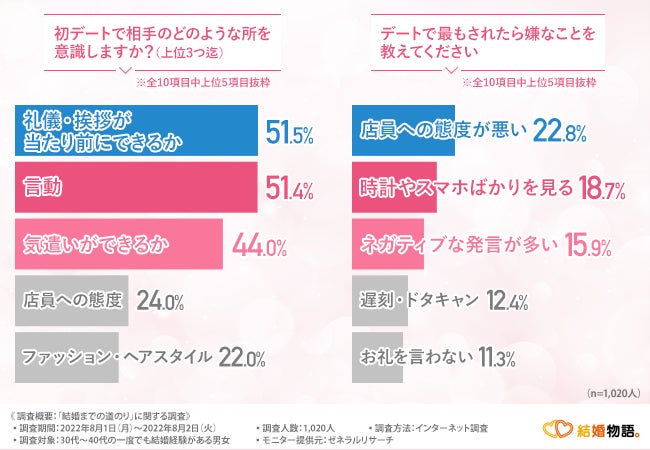 そこで、「初デートで相手のどのような所を意識しますか?(上位3つ迄)」と質問したところ、『礼儀・挨拶が当たり前にできるか(51.5%)』と回答した方が最も多く、次いで『言動(51.4%)』『気遣いができるか(44.0%)』と続きました。