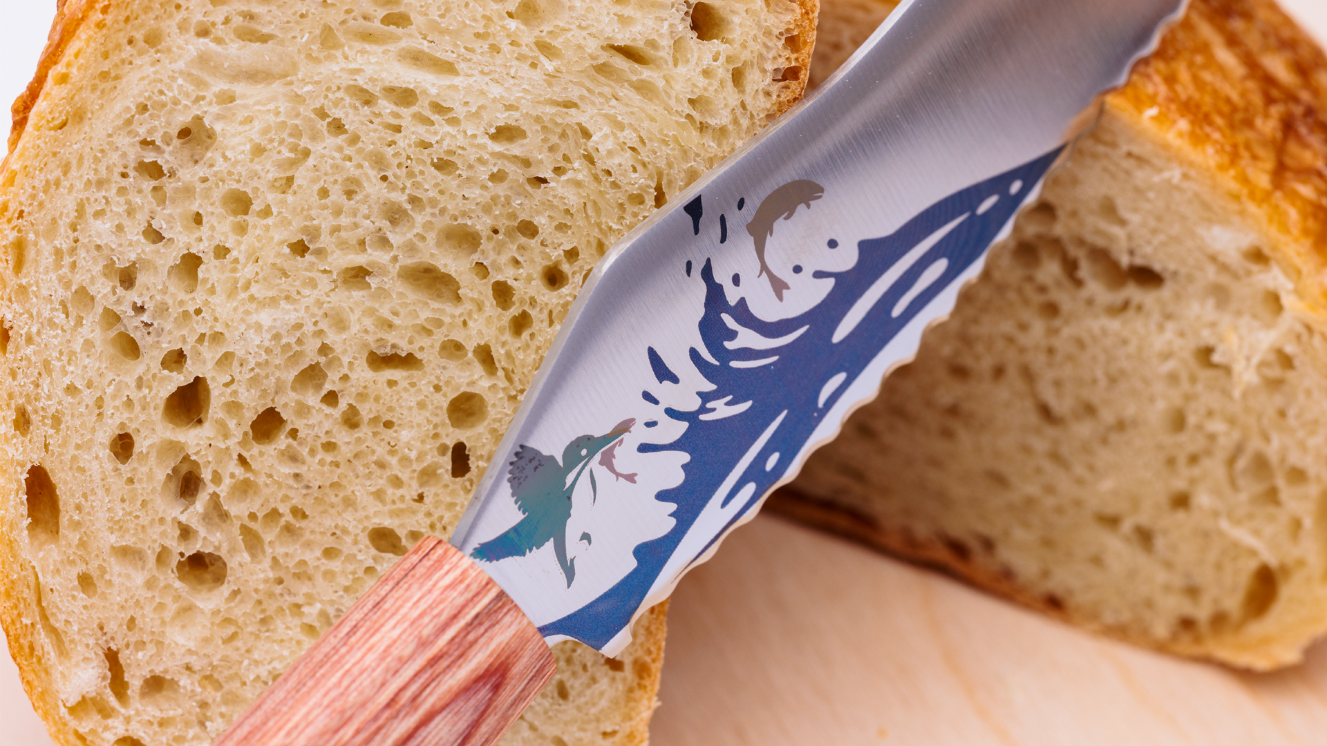 全体のなめらかなフォルムは岐阜県関市の美しい自然を体現しています。岐阜県関市が世界に誇る川の清流をパン切り包丁の波刃に。山紫水明を体現する岐阜県関市の山々を、人差し指のストッパーにして表現。ブレード部分には清流・かわせみ・鮎が日本先端技術カラーレーザー彫刻が施され、すっと切れるパンの美しい切り口とともに、彩ある「関流」を添えることでさらに映える料理写真が表現できます。