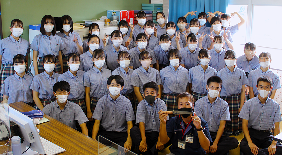 「至誠明朗」の校訓を体し、知・徳・体の調和のとれた創造的・人間性豊かな実践力のある地域社会人の育成を図ることを目標としています。今回企画・販売するのは、総合ビジネス科の3年生38人です。関商工会議所青年部主催の関メタルアート2022の事業の一環として、オリジナル包丁の開発をする商業科の授業を行いました。38人がアイディアを出し合ったり、どうしたら切れる包丁になるのかの実習などを行いました。
