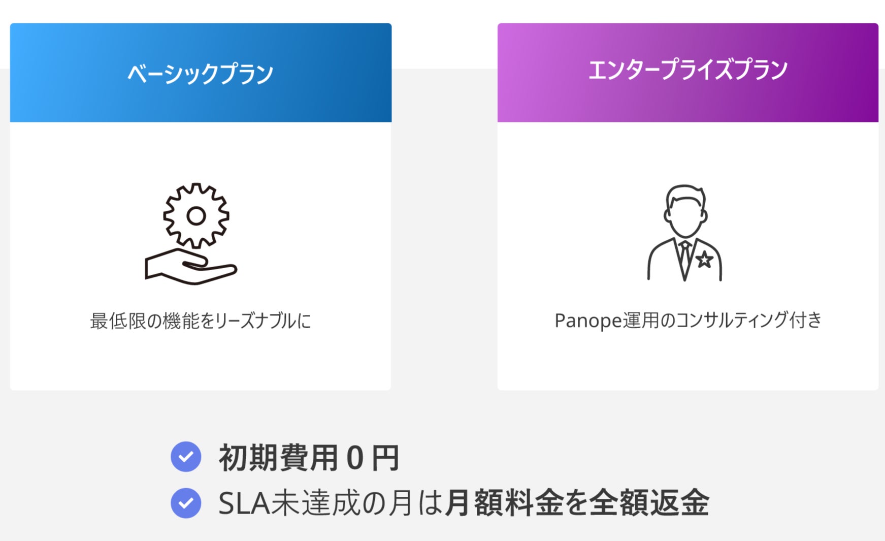 Panope では、お客様のニーズを確実に実現するため、「SLA 未達成の月は月額料金を全額返金」という完全成果コミット制の料金体系を採用しています。また、サービスの質に対する確かな自信から、Panope では SLA を99.9% 以上と設定しています。