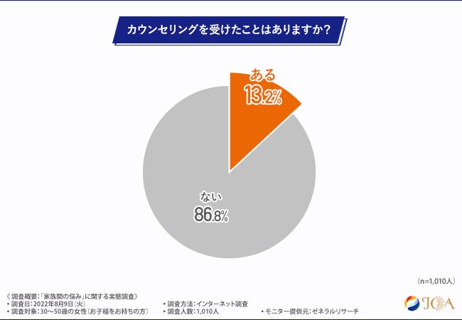 そこで、「カウンセリングを受けたことはありますか?」と質問したところ、約1割の方が『ある(13.2%)』と回答しました。