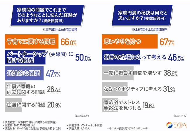 そこで今回、カウンセリング技術の学校(https://japan-counseling.jp/counseling-school/)を運営する一般社団法人日本カウンセリング協会(https://japan-counseling.jp/)は、30~50歳の女性(お子様をお持ちの方)を対象に、「家族間の悩み」に関する実態調査を実施しました。