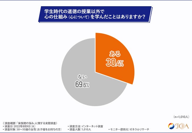 「学生時代の道徳の授業以外で心の仕組み(心について)を学んだことはありますか?」と質問したところ、約3割の方が『ある(30.4%)』と回答しました。