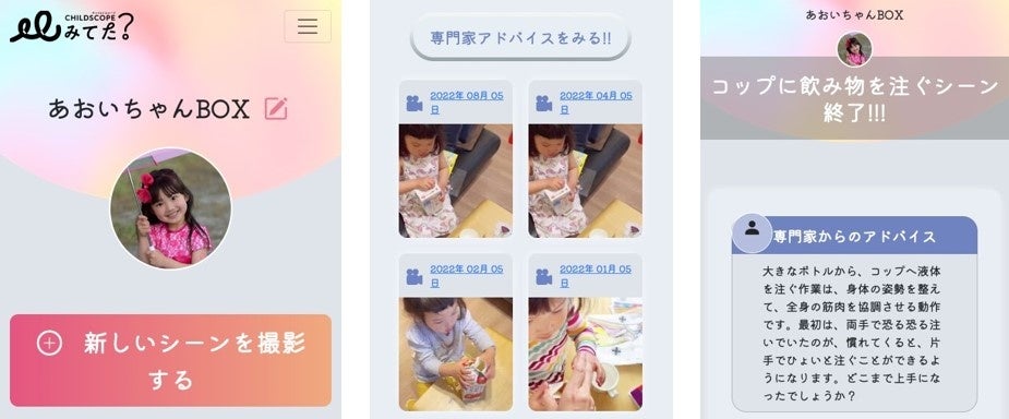 本アプリでは、子どもの「ごっこ遊び」や、ペットボトルの飲み物を注ぐシーンなど、親が選んだ特定のシーンを一定期間の間に複数回にわたり撮影し、都度アプリにアップロードしていきます。撮影時間は1~3分程度。同じ動作のシーンを記録し『観察』していくことで、何気ない日常生活の中の、子どもの成長の小さな変化や発達の瞬間を、客観的に観察・確認することができます。また、子どもにとっても、自身の成長・発達を客観的に見ることで、自信と自己肯定感が育まれます。日々様々な成長・発達を重ねる子どもの変化を親子で楽しんで頂ける、従来にはなかった視点のアプリです。