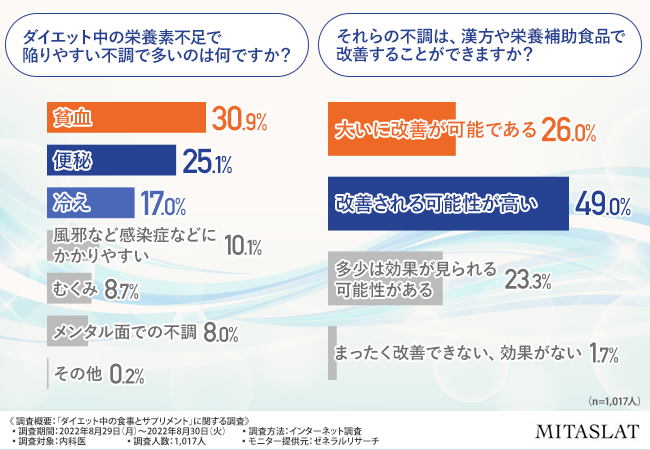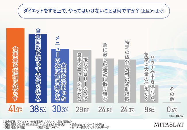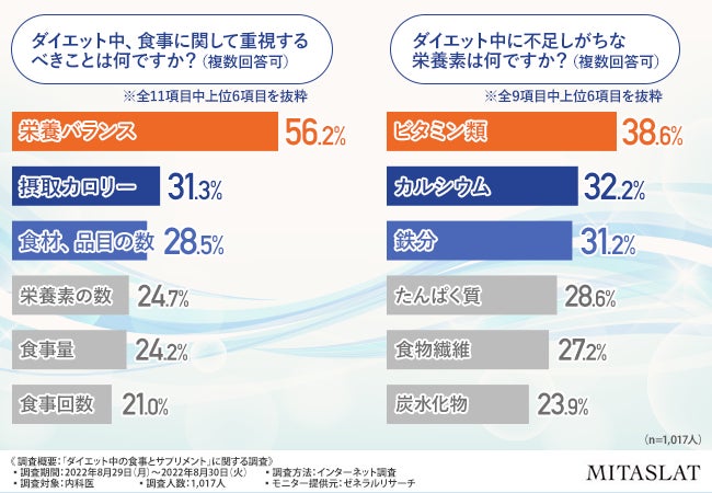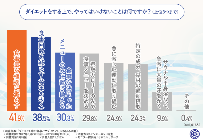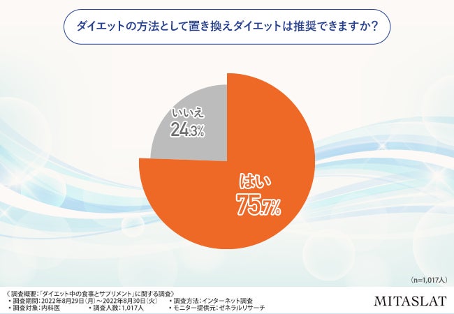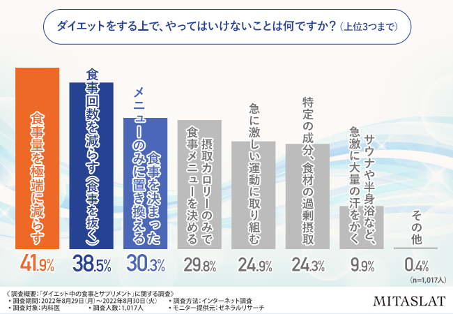 そこで今回、株式会社Terizeは、『MITASLAT(ミラスタット)』(https://beautymakelabo.jp/shopping/lp.php?p=mitaslat)を発売するに際し、内科医を対象に「ダイエット中の食事とサプリメント」に関する調査を実施しました。