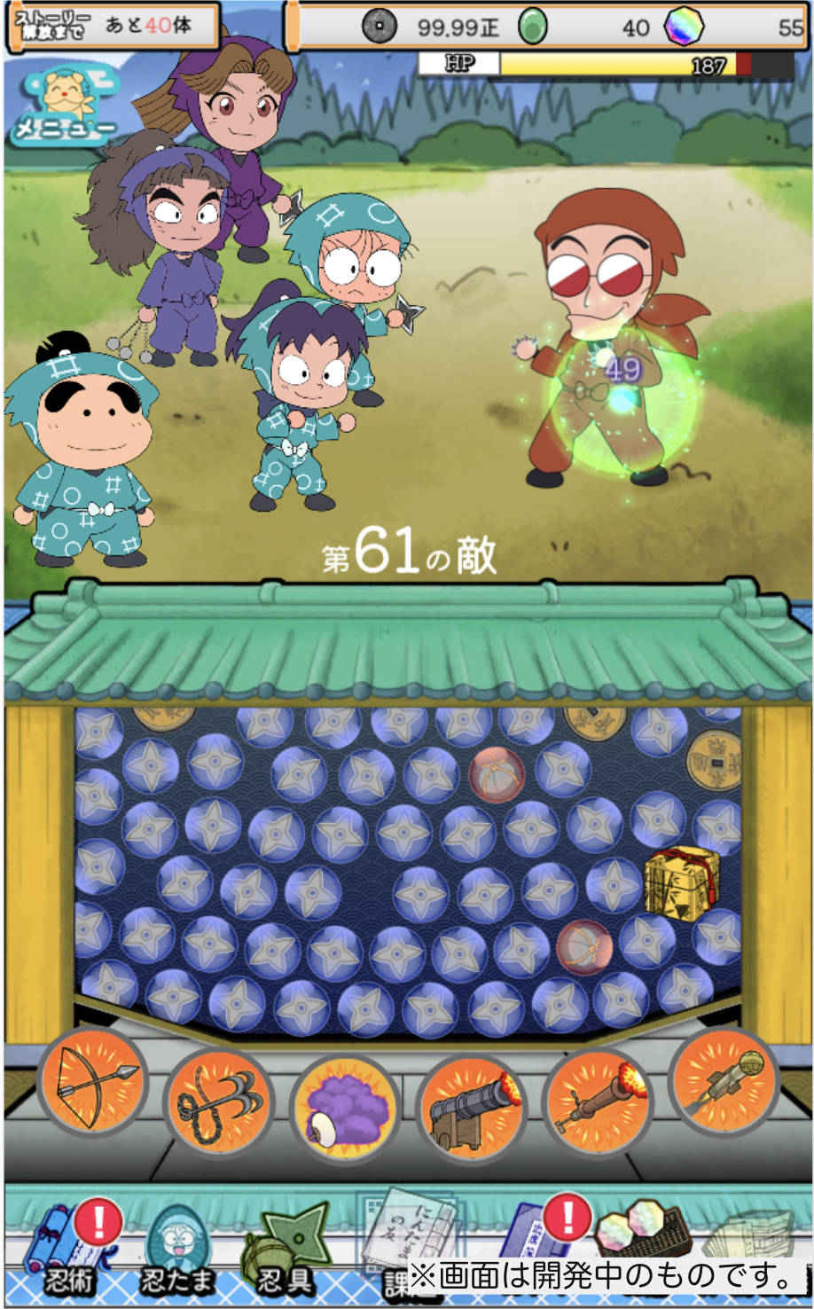 およそ30体以上登場する忍たまたちには、それぞれ攻撃力や特殊能力に違いがあり、部隊として最大7人までを組み合わせて、続々と現れる野生動物やコピー忍者たちに挑みます。