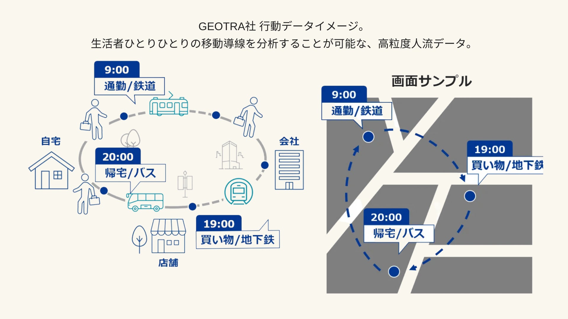 株式会社GEOTRA(本社 : 東京都千代田区、代表取締役社長 : 陣内寛大、以下「GEOTRA」)は、Spatial Pleasure(運営会社 : 株式会社Placy、本社 : 東京都世田谷区、代表取締役社長 : 鈴木綜真)と協業し、都市ポテンシャル最大化を目的とした分析業務に係るパートナーシップを締結しました。Spatial Pleasureが持つアルゴリズムと、GEOTRAが持つ人流シミュレーション技術を活用し、高精度な人流ペルソナを構築することで、長期的なエリア価値向上に資する分析業務に取り組みます。