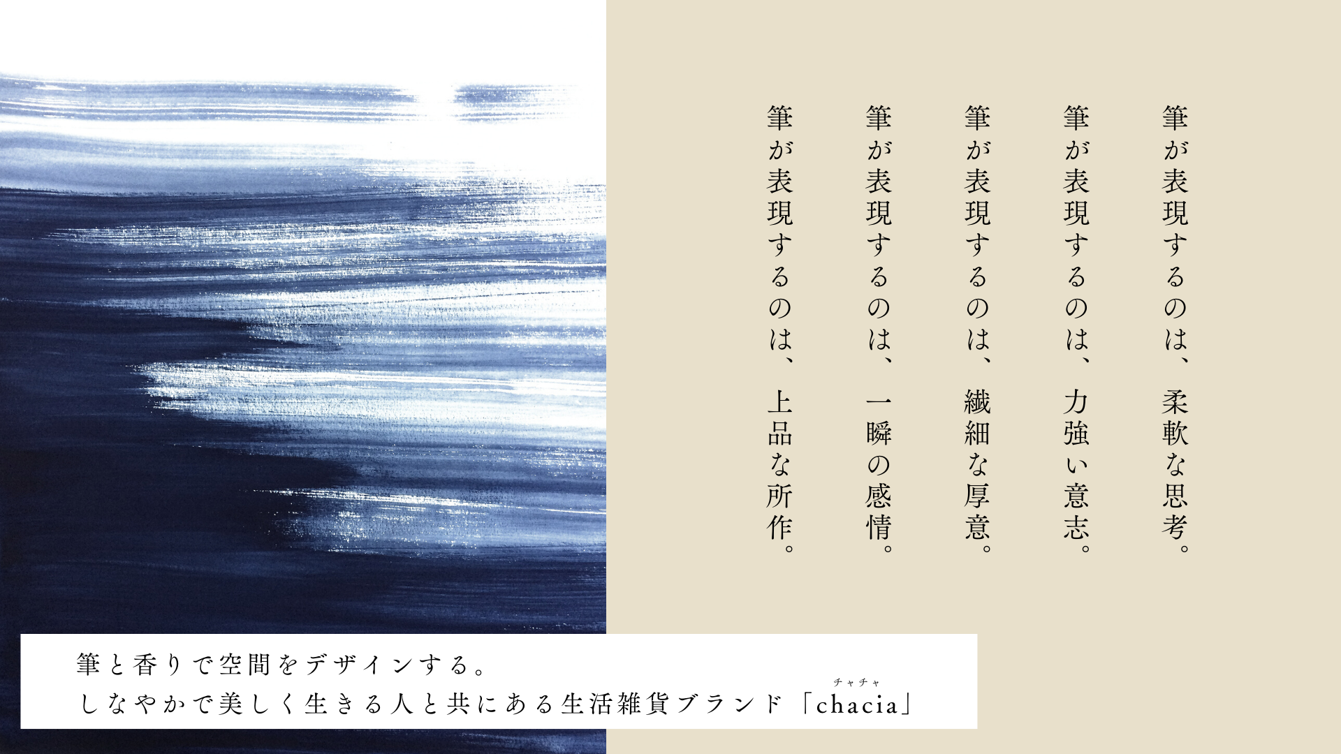 「chacia」は、しなやかで美しく生きる20~30代の人々をメインに、日々の暮らしで自分らしさを表現できる生活雑貨を提供します。それを叶えるべく、私たちは日本が誇る魅力の一つである“筆”の質感に注目し、デザインに採用しています。
