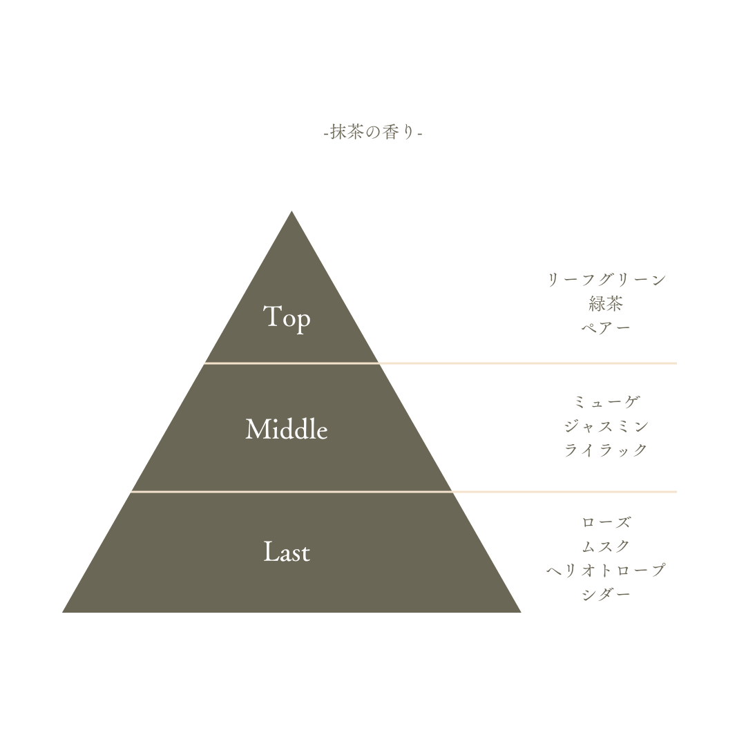 樹木はボルネオール・ライラック・サンダル・ジャスミンが「菩提樹」の甘く官能的な花の香りを表現しています。抹茶はリーフグリーン・ペアー・ミューゲ・ジャスミン・ローズが高級感を与えるオリエンタルなお茶の香りです。