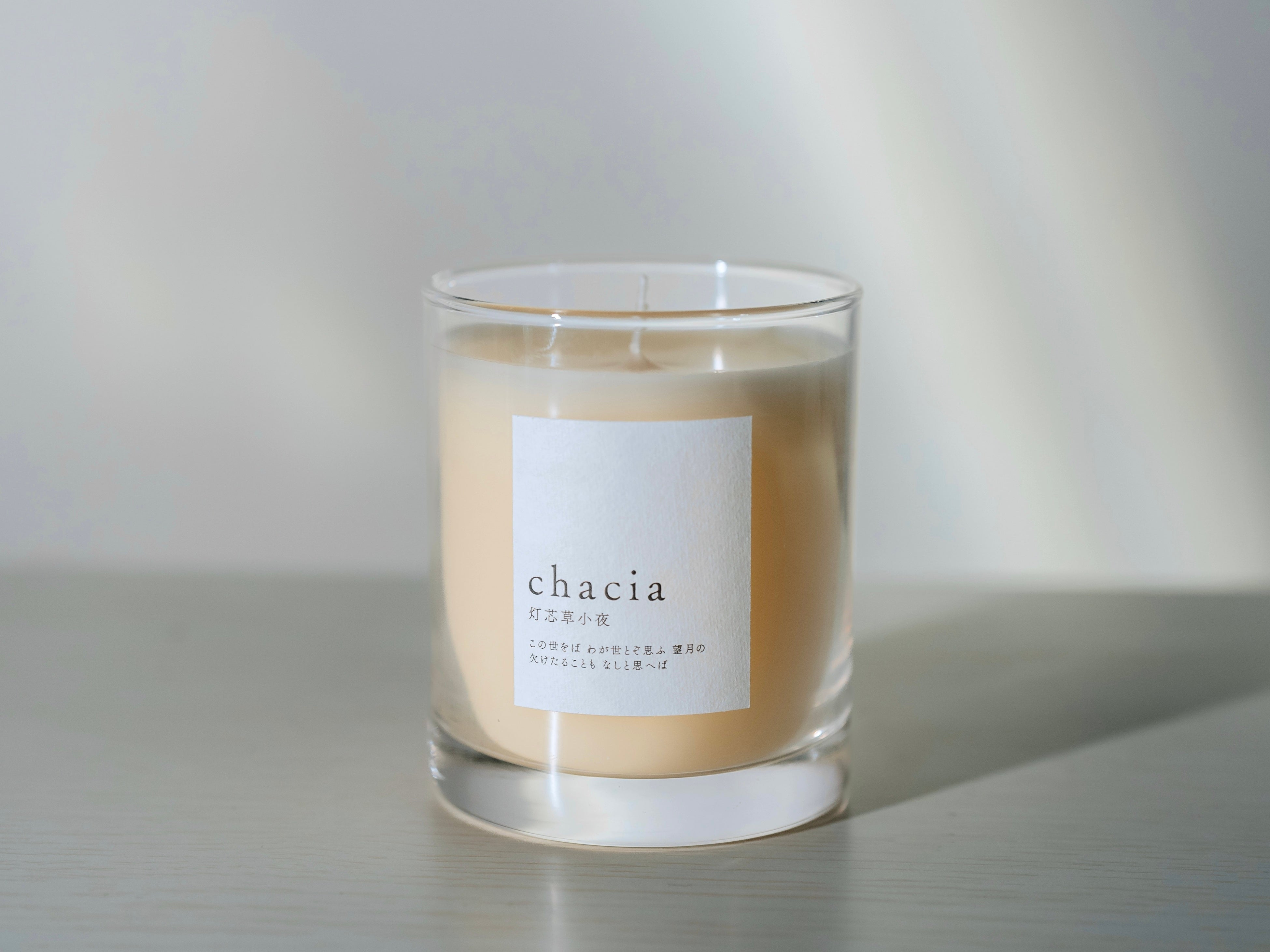 chaciaのロゴと短歌が入ったシンプルなデザインのアロマキャンドルです。