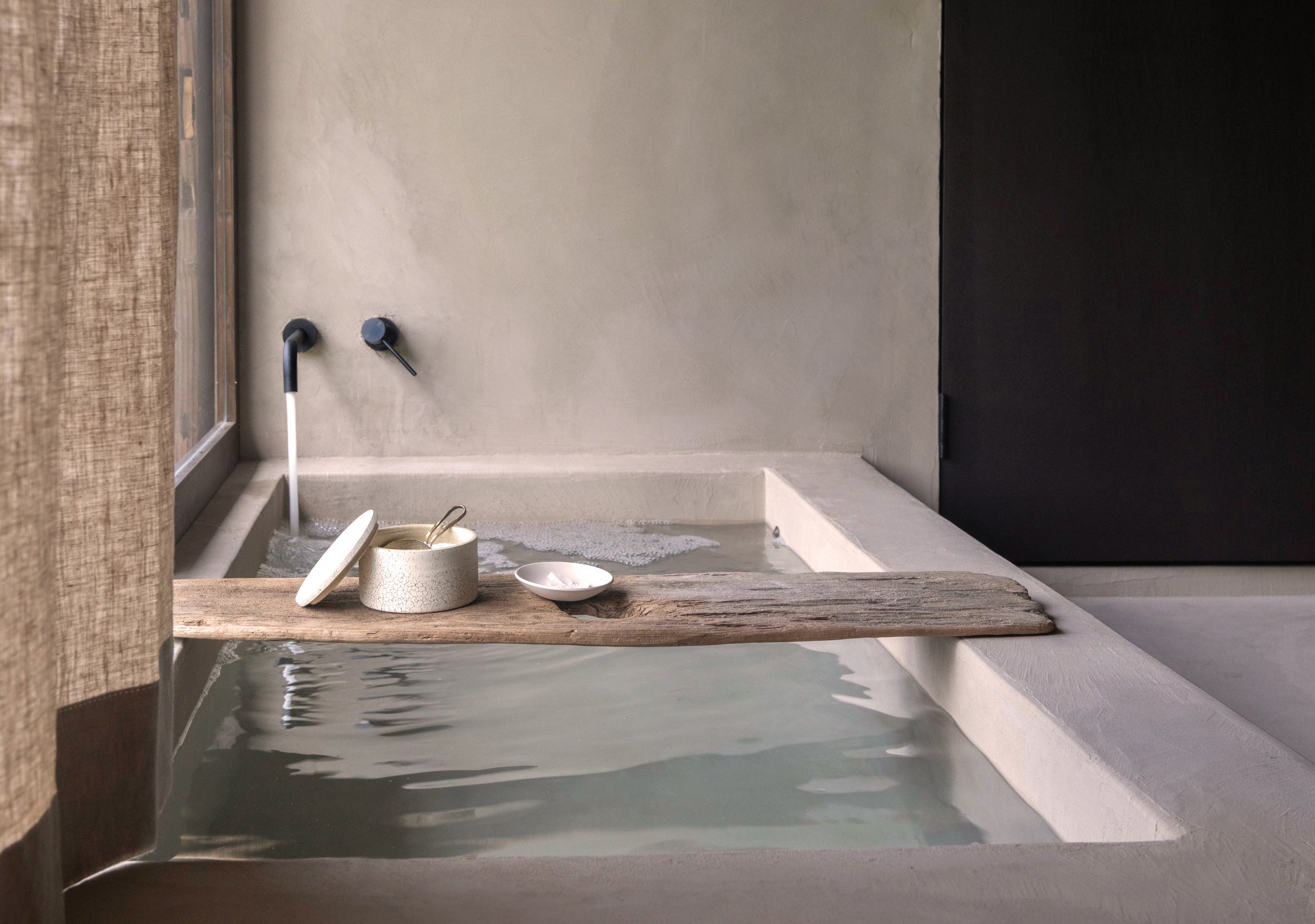 「古の京都と現代を繋ぐ」をコンセプトに、 マーナ清水の客室は、伝統的な町家へのオマージュと大胆な再創造が施されています。 京町屋のリノベーションでは傑出した存在として知られている建築家・魚谷繁礼のデザインにより、狭く暗い空間に光と風を巧みに取り込み、テクスチャーのある漆喰の壁に自然光が降り注ぎます。 また、各部屋には瞑想のためのスペースがあり、有名な和紙職人Hatano Wataruの手による、継ぎ目がなく質感の高い和紙が敷き詰められています。館内の至る所で使用されている信楽のプレート、提灯ランプシェード、さしこの枕などは、POJとの共同作業によりオーナーたちが京都の職人たちに依頼して作ったものが使用されています。そしてもちろん、MAANAならではの入浴体験は、模した信楽焼のバスタブで完成します。洗練されたモダンなインテリアの中に、オーナー等が選び抜いた、時を経た日本の骨董品が、古いものと新しいものの見事なバランスを生み出しています。