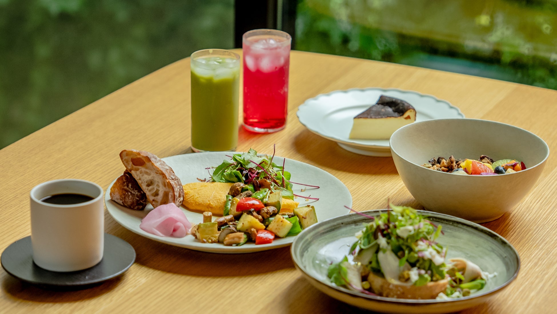野菜のお出汁をベースに、京白味噌仕立ての「季節野菜のスープ」。そしてスープと一緒にお召し上がりいただくのは、米糀・甘酒を使用した「糀パン」。そして洋朝食のメインは、「喫茶喜心」では、平飼い有精卵「京都静原・しずたま」を使用した、シンプルでありながら滋味深いオムレツをご提供。外はふわり、中はとろり、九条ねぎやきのこ、チーズなど季節に合わせて具材は変化します。また、野菜は京都・大原の京野菜を中心に地野菜のローストと、カリカリちりめん山椒の食感がたのしいサラダ、大根の柴漬けや茗荷の甘酢漬けなど自家製ピクルスが添えられます。洋の朝食を通じ、京都の気配を感じる食卓をご堪能ください。