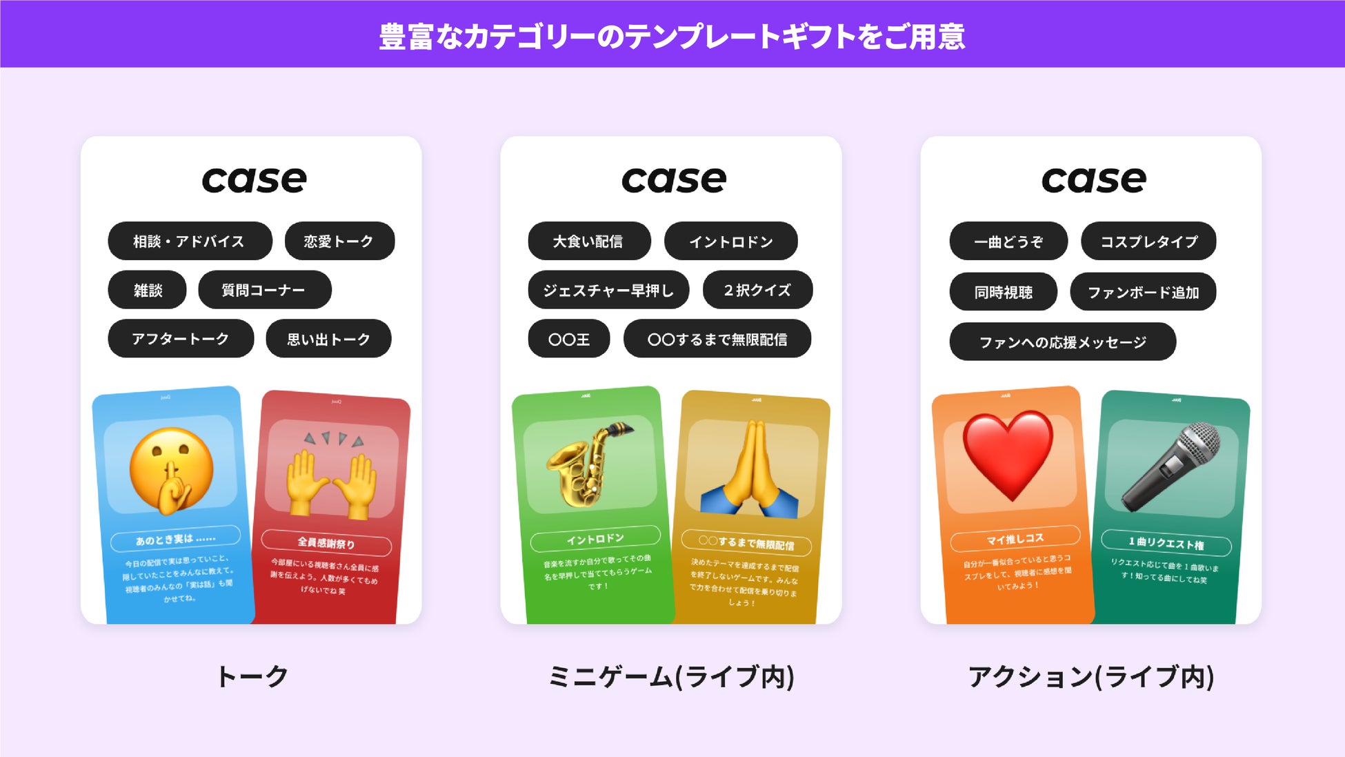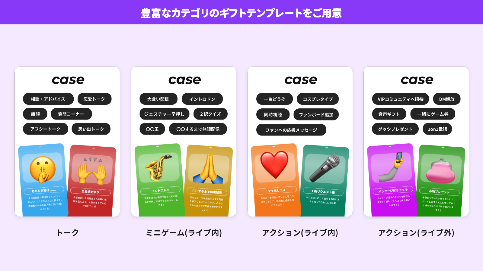 配信者がよりファンを楽しませるエンタメを提供できるよう独自のテンプレートギフトを用意しております。テンプレートギフトを使用することで、人気のエンタメギフトをすぐに自身の配信に取り入れることができます。