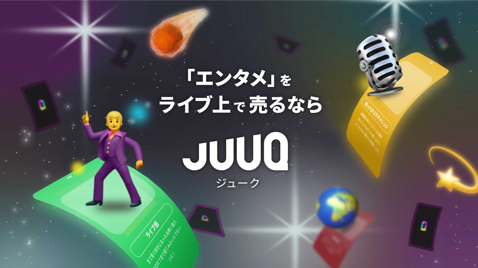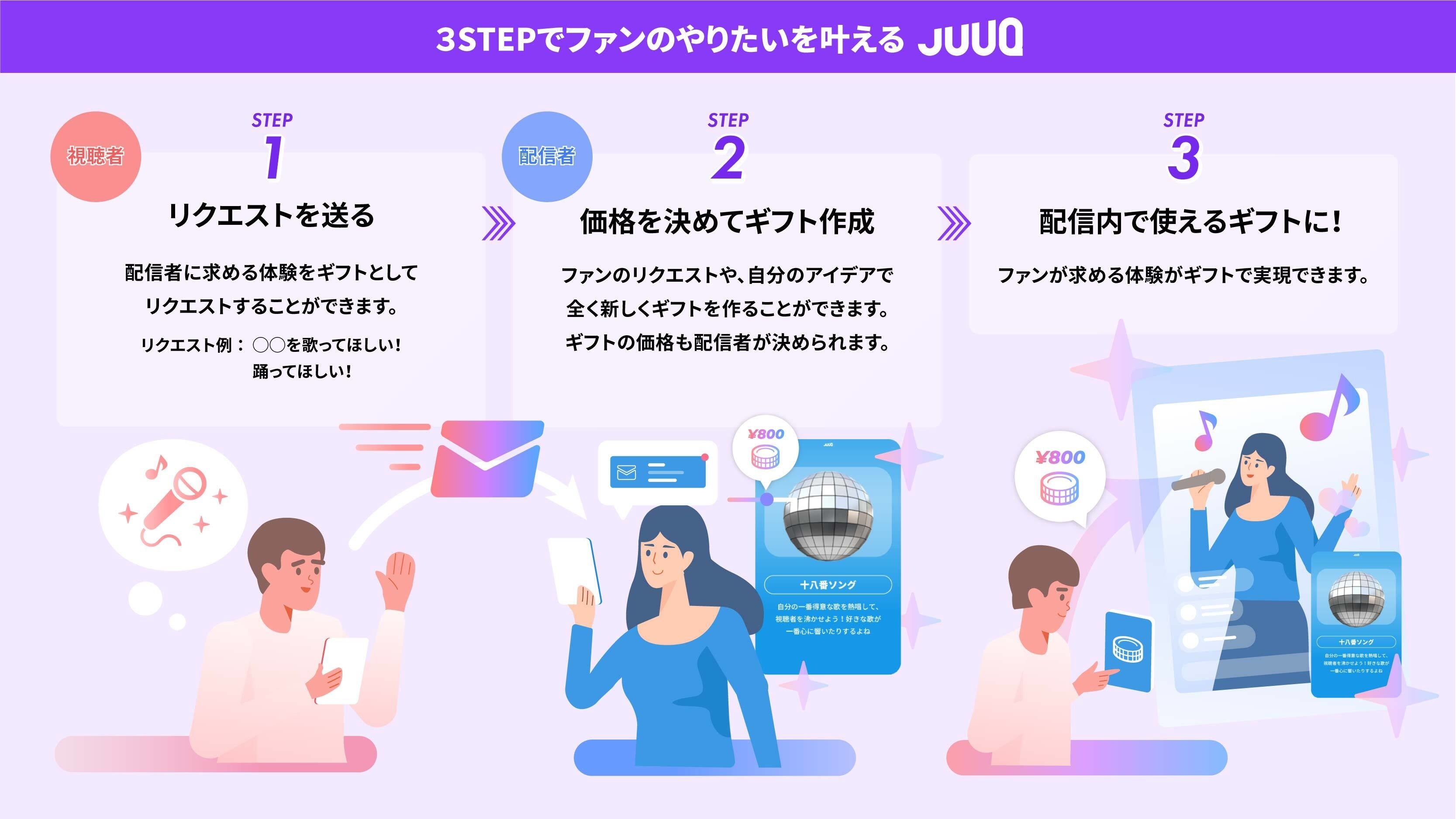 JuuQ(ジューク)はファンの要望や自分が売りたいエンタメ体験(トーク、歌、ミニゲーム)から配信で使用できるギフトを作成し、ライブ上で販売できるライブコマース*サービスです。JuuQを使用することで、従来は運営によって作られていた配信ギフトを自由にカスタマイズして販売することが可能になり、新しい収益源を作るのみならず、オリジナルの配信を実現し、配信者の継続的な活動をサポートします。サービスURL: https://juuq.club/