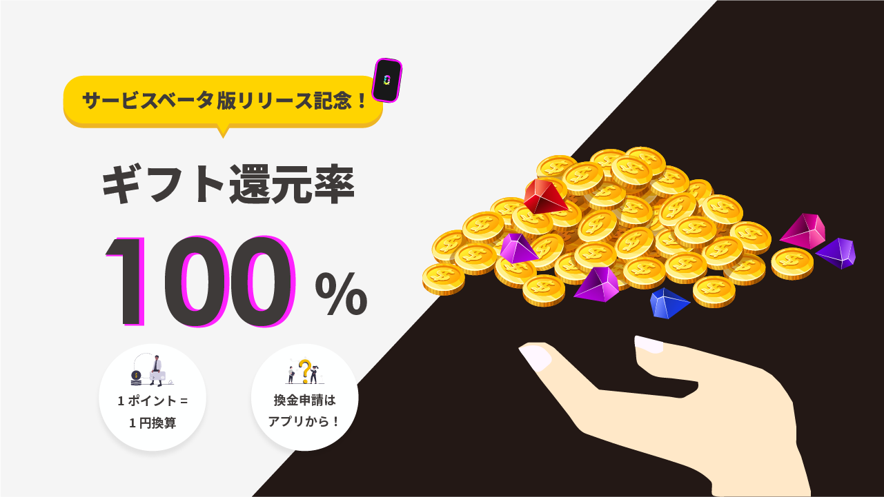 この度JuuQ(ジューク)β版のリリースを記念いたしまして視聴者が購入したギフトの全額を還元するキャンペーンを実施します。ギフトの販売で獲得したアプリ内ポイントは1ポイント1円で換金することが可能です。