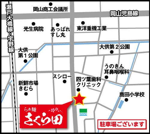 JR岡山駅と大元駅の中ほどに位置し、島田筋沿いに複数台駐車可能なパーキングを備えて「らぁ麺さくら田」としてグランドオープンいたします。