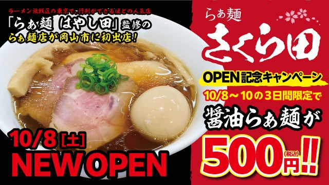 【岡山市初上陸】名店はやし田プロデュースのラーメン店「さくら田」が近日新規開店!グランドオープン記念として3日間、醤油らぁ麺を500円で提供!