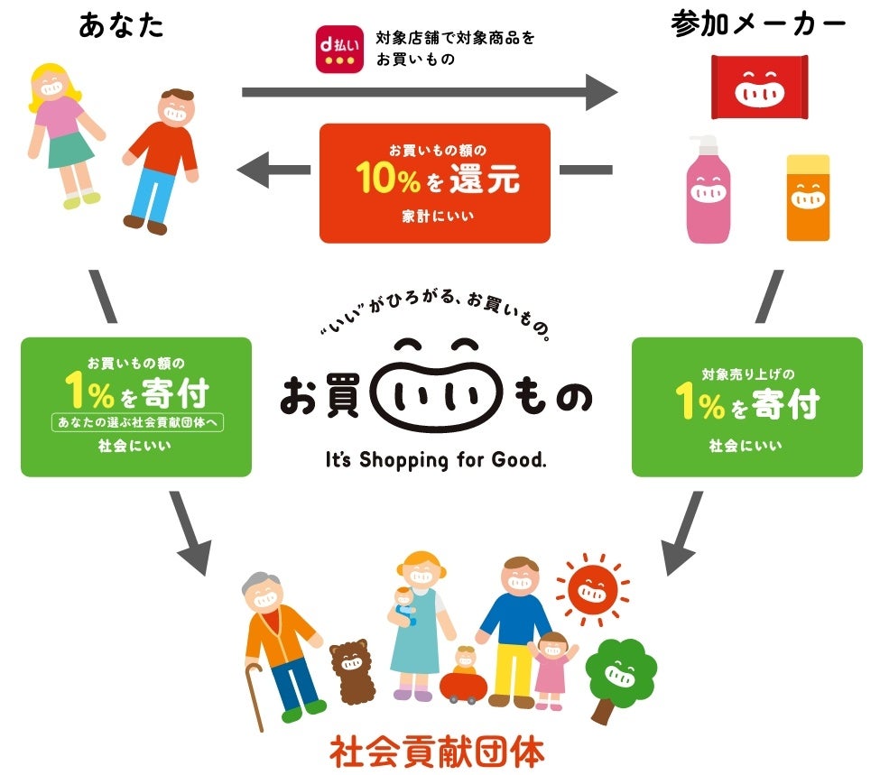 プロジェクト第1弾では、花王株式会社、ネスレ日本株式会社、株式会社NTTドコモ、株式会社電通の4社、流通企業20社が参画。9月1日より対象店舗で対象商品をd払い(コード決済)で購入すると、お買いもの額の1%が、購入者ご自身の選ぶ社会貢献団体へ寄付され、購入者にも最大10%還元される取り組みを実施いたします。また、参画メーカーも本プロジェクトを通じて対象売り上げの1%を社会貢献団体へ寄付いたします。
