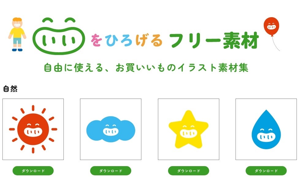 本プロジェクトをより身近に感じていただくべく、「お買いいもの」のキャラクターをフリー素材として公式サイト上で公開しています。規約の範囲内であれば、 個人、法人、商用、非商用問わず無料でご利用いただけます。