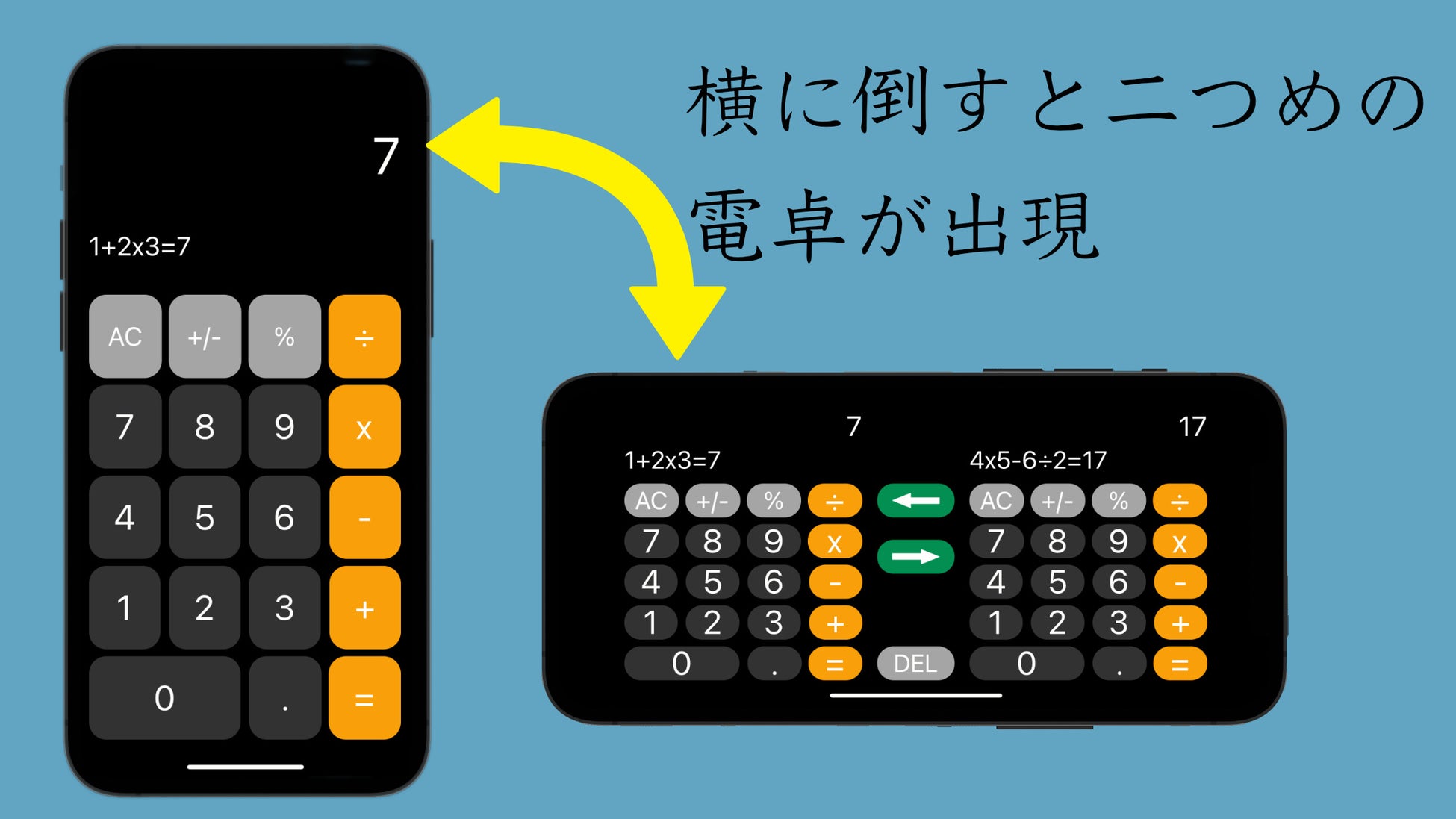 ◆横向きの画面に二つの電卓が並ぶ