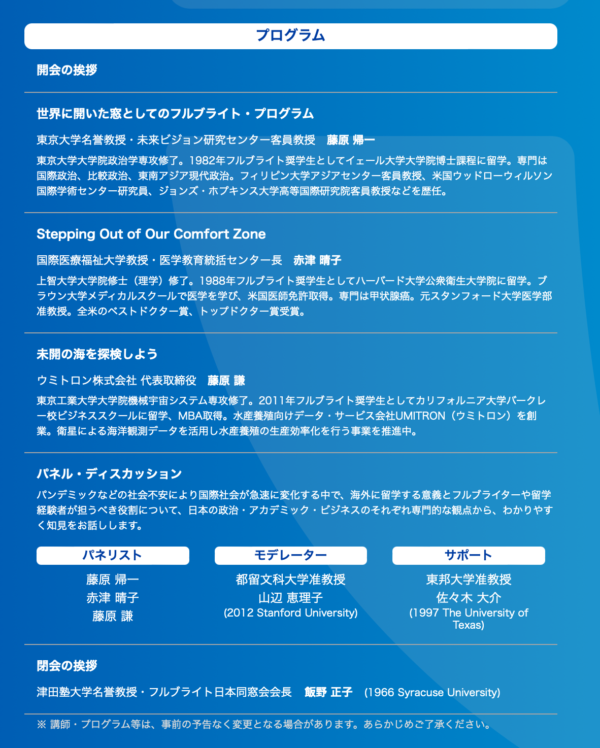 | パネル・ディスカッション パンデミックなどの社会不安により国際社会が急速に変化する中で、海外に留学する意義とフルブライターや留学経験者が担うべき役割について、日本の政治・アカデミック・ビジネスのそれぞれ専門的な観点からわかりやすくお話しします。 |