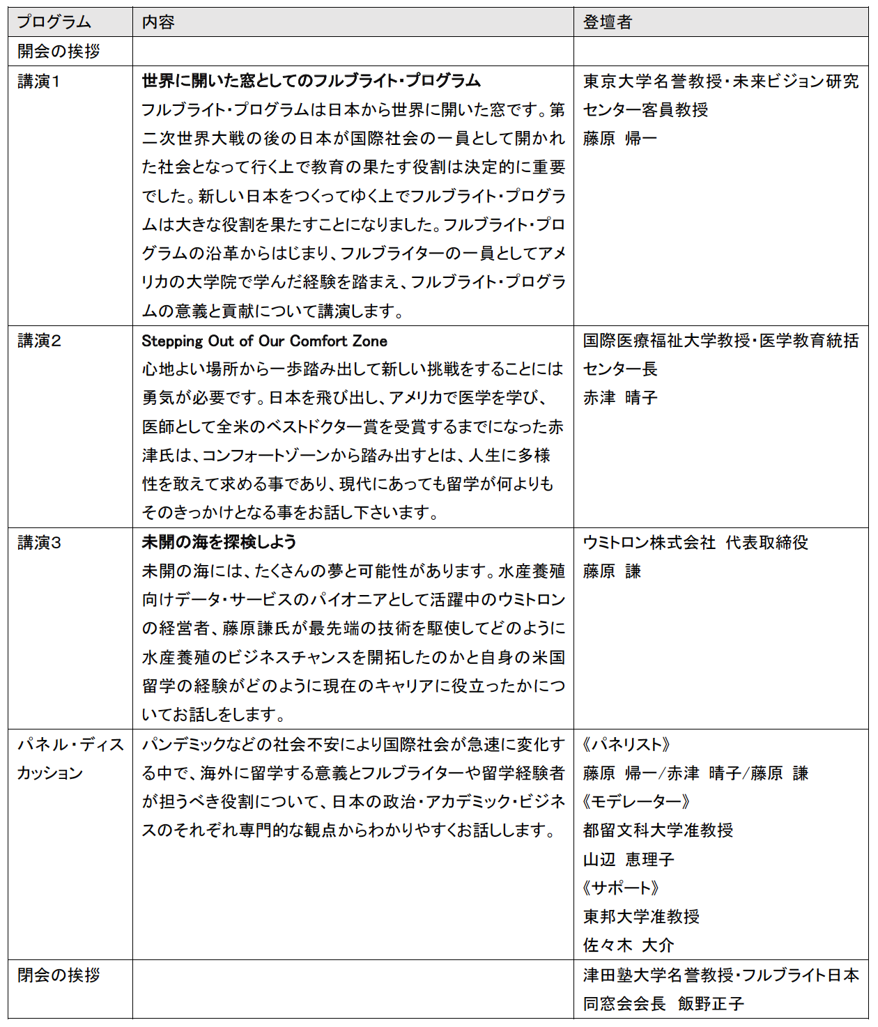 当日は、学術界、医療界、経済界の各分野からフルブライター(フルブライト・プログラムの同窓生)3名を招き、それぞれの専門的視点から講演を行うとともに、パネルディスカッションでは、パンデミックなどの社会不安により国際社会が急速に変化する中で、海外に留学する意義とフルブライターや留学経験者が担うべき役割について討論します。