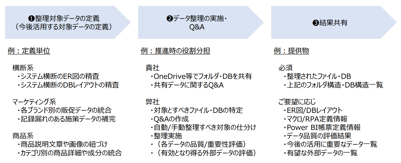 ・消費財メーカー:新商品開発の高度化に資する属人データの適正化を目的に、配荷率や棚割優遇、成分比といった20種以上の属人データから30種以上の業務データを適正化。