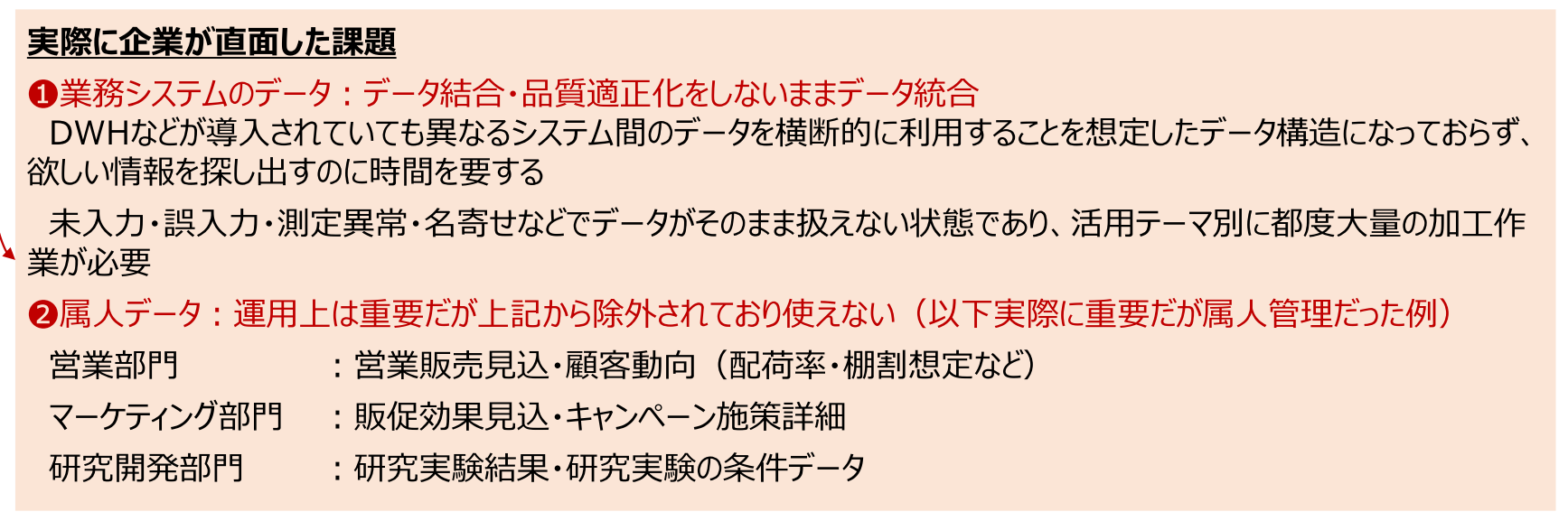 DWHなどが導入されていても異なるシステム間のデータを横断的に利用することを想定したデータ構造になっておらず、欲しい情報を探し出すのに時間を要する。