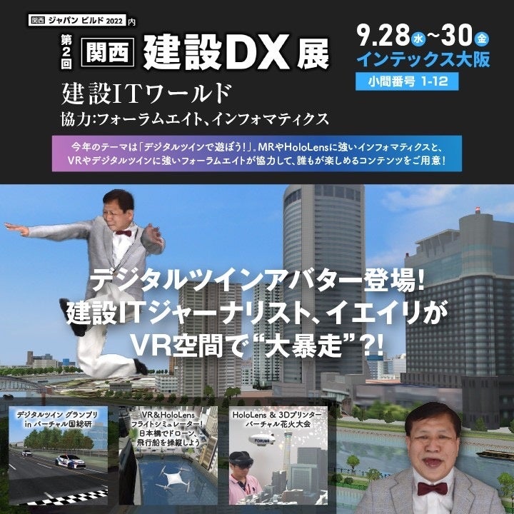 株式会社建設ITワールド(本社:東京都港区、代表取締役:家入龍太)は、株式会社インフォマティクス(本社:神奈川県川崎市、代表取締役社長:齊藤大地)、株式会社フォーラムエイト(本社:東京都品川区、代表取締役社長:伊藤裕二)の協力を得て、2022年9月28日(水)~9月30日(金)に、インテックス大阪で開催される第2回「建設DX展(関西展)」に出展します。
