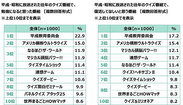 - 勉強になると思ったクイズ番組、復活してほしいと思うクイズ番組 いずれも『平成教育委員会』が1位に