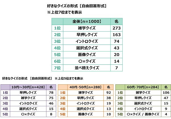 - 好きなクイズの形式 1位「雑学クイズ」2位「早押しクイズ」3位「イントロクイズ」