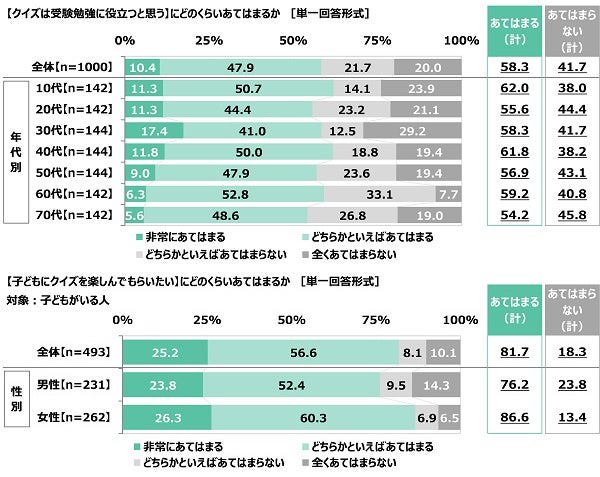 - 「クイズは受験勉強に役立つと思う」58%、10代と40代では62%