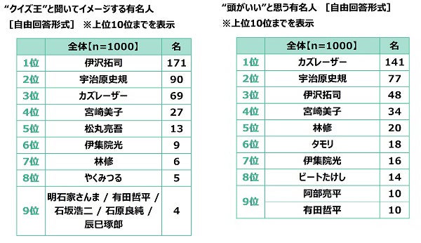 - “クイズ王”と聞いてイメージする有名人 1位「伊沢拓司さん」2位「宇治原史規さん」