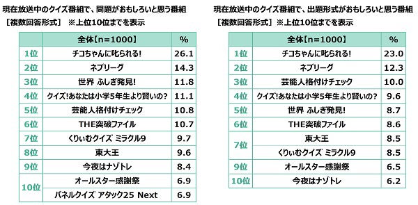 問題がおもしろいと思う番組を聞いたところ、1位『チコちゃんに叱られる!』(26.1%)、2位『ネプリーグ』(14.3%)、3位『世界 ふしぎ発見!』(11.8%)となり、出題形式がおもしろいと思う番組を聞いたところ、1位『チコちゃんに叱られる!』(23.0%)、2位『ネプリーグ』(12.3%)、3位『芸能人格付けチェック』(10.0%)となりました。