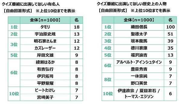 クイズ番組に出演してほしい歴史上の人物を聞いたところ、1位「織田信長」、2位「聖徳太子」、3位「坂本龍馬」となりました。また、『学問のすゝめ』の著者である「福沢諭吉」が5位、物理学者の「アルベルト・アインシュタイン」が6位、アニメ『一休さん』のモデルになった僧の「一休宗純」が8位となりました。