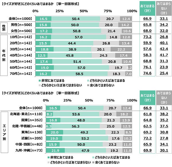 - 「クイズが好き」67%、10代では73%、60代では76%、クイズファンの割合は近畿で高い傾向