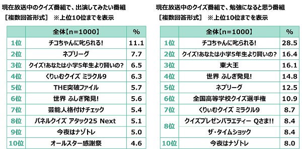 - 勉強になると思うクイズ番組 1位『チコちゃんに叱られる!』2位『クイズ!あなたは小学5年生より賢いの?』