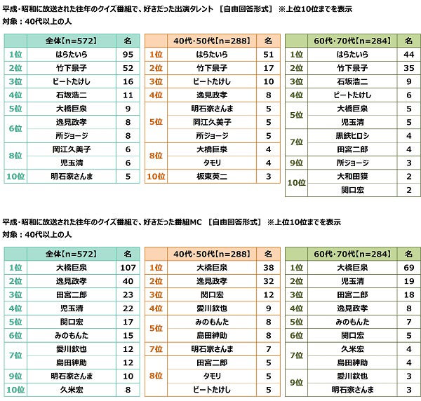 - 40代以上の人が好きだったクイズタレント 1位「はらたいらさん」2位「竹下景子さん」