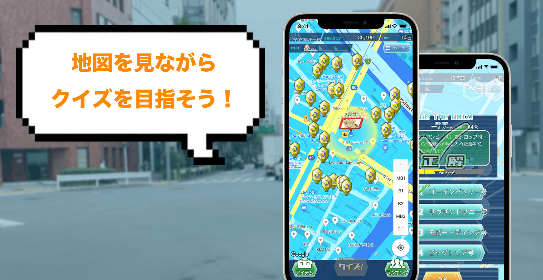 現在位置の周辺に表示されるクイズポイントを目指して移動し、クイズポイントに到着するとクイズが出題されます。