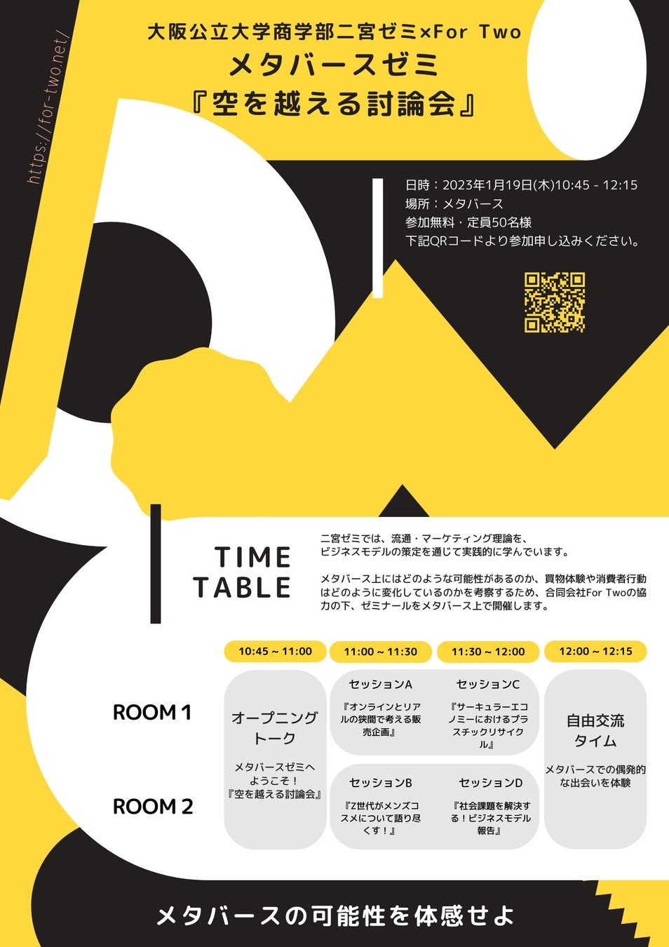 大阪公立大学商学部二宮ゼミと共同でメタバース上にてオープンゼミを開催します。開催日時は2023年1月19日(木)10時45分〜12時15分。