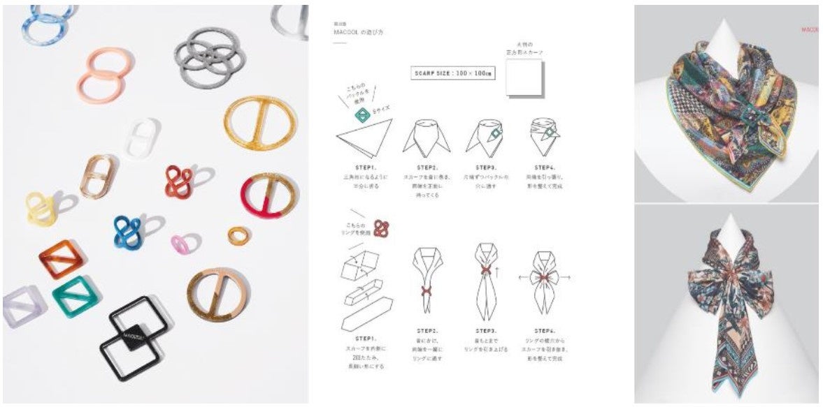 スカーフにチャレンジしたいけど、どうやって巻いていいかわからない、というお客さまの声から、マクールが独自で開発したアイテムです。バックルの穴にスカーフを通すだけ、というテクニックいらずの簡単さで、一枚のスカーフを何通りにもアレンジ可能。今日の気分やスタイルに合わせてご使用ください。