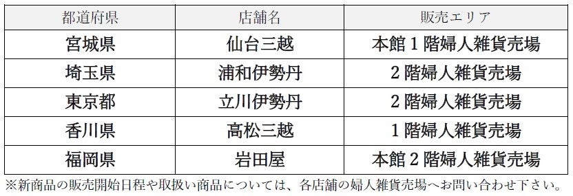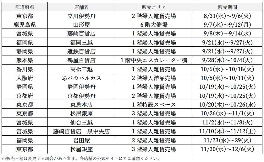 今回の販売では、店舗販売を拡充。常設販売5店舗(仙台三越、浦和伊勢丹、立川伊勢丹、高松三越岩田屋(福岡)に加え、東急本店(渋谷)、松屋銀座、あべのハルカス(大阪)、京都伊勢丹、福岡三越など各地の主要百貨店16店舗にてポップアップショップ(期間限定販売)をオープン。