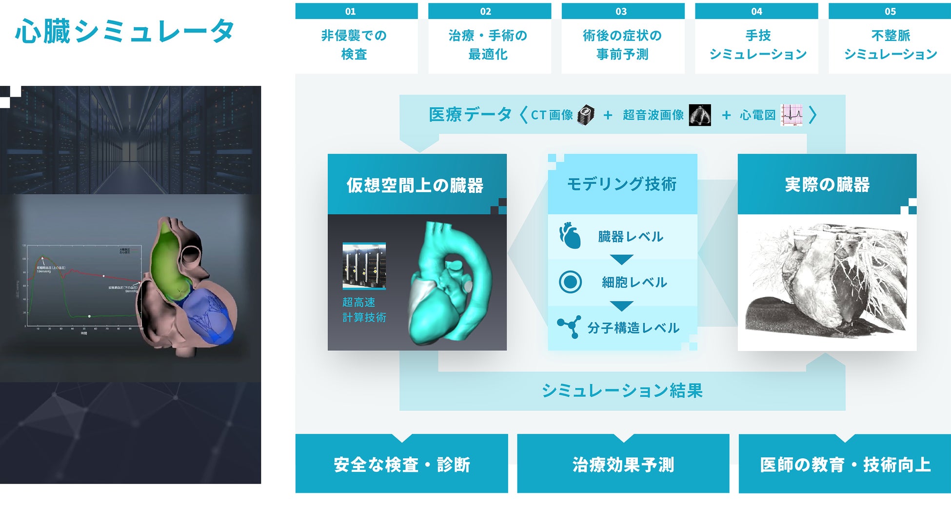 心臓シミュレータ(下図)とは、東京大学と富士通が10年以上かけて、スーパーコンピュータ上で作り上げた、世界最高峰のテクノロジーです。CTや超音波画像を含む臨床データをインプットデータとし、スーパーコンピュータの演算能力を活用して、分子レベルの電気的・力学的挙動を計算することで、個人の心臓の動きを忠実に細かい部分まで再現できます。