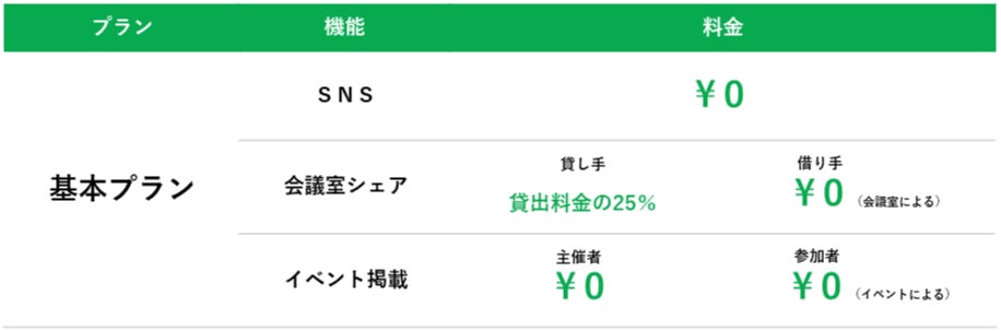「SNS」「会議室シェア」「イベント」のIDは一つだけ。イベントの開催・参加、会議室シェアの貸し手・借り手でIDを分ける必要がありません。
