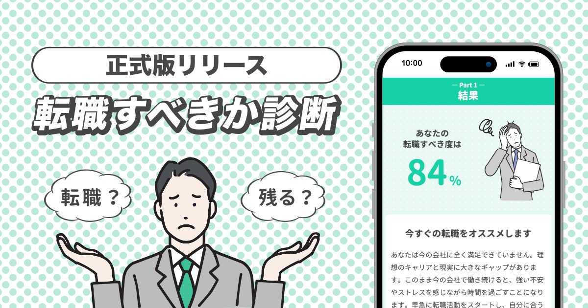 株式会社Questi(本社:東京都渋谷区、 代表取締役社長:齋藤智也)は、かねてよりβ版で提供しておりました「転職すべきか診断」の正式版の提供を本日より開始いたしました。
