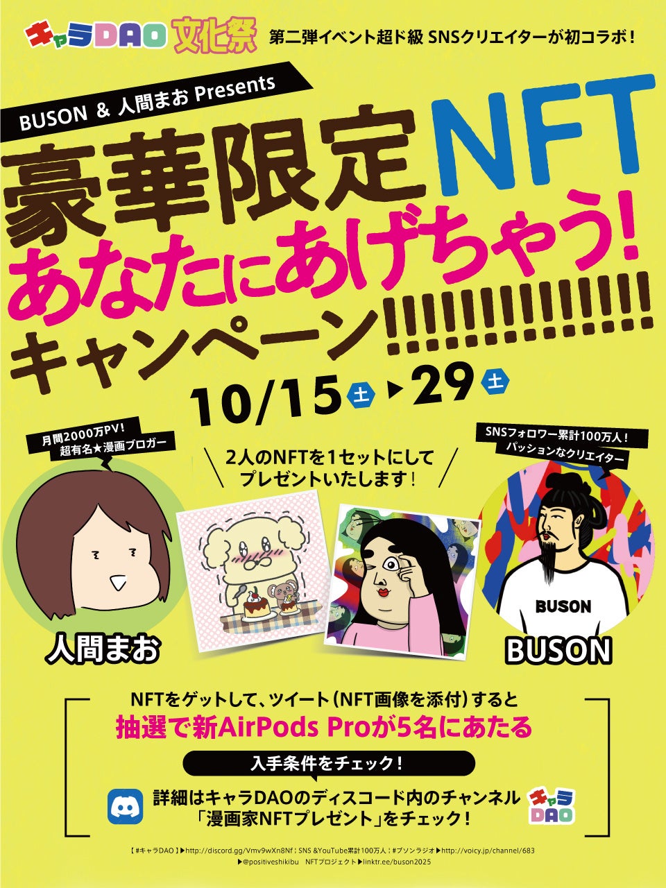 「キャラクターの命のバトンはNFT」をコンセプトにNFTプロジェクトを展開するキャラDAO (Founder: BUSON) は、この度、SNSを中心に人気を集める漫画家やクリエーターをゲストにお呼びして、豪華限定NFTプレゼントキャンペーンを行います。既存のSNS、つまりweb2.0領域で活躍されているクリエイターさんをNFT、web3.0領域に呼び込むことで、キャラDAOやコラボクリエイターさんのみならず、業界全体へ強いインパクトを与えうる企画になります。