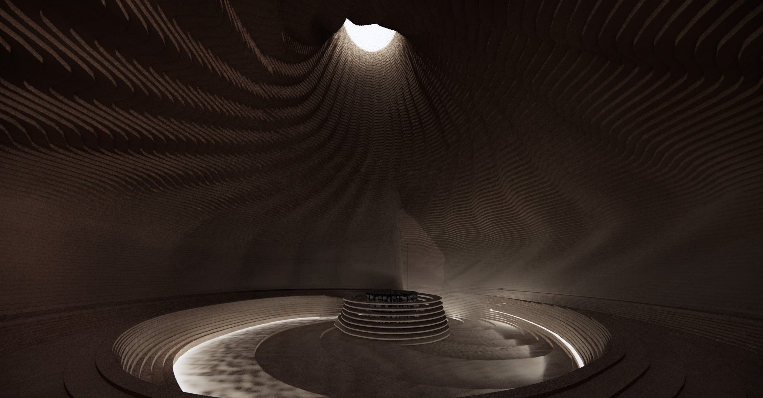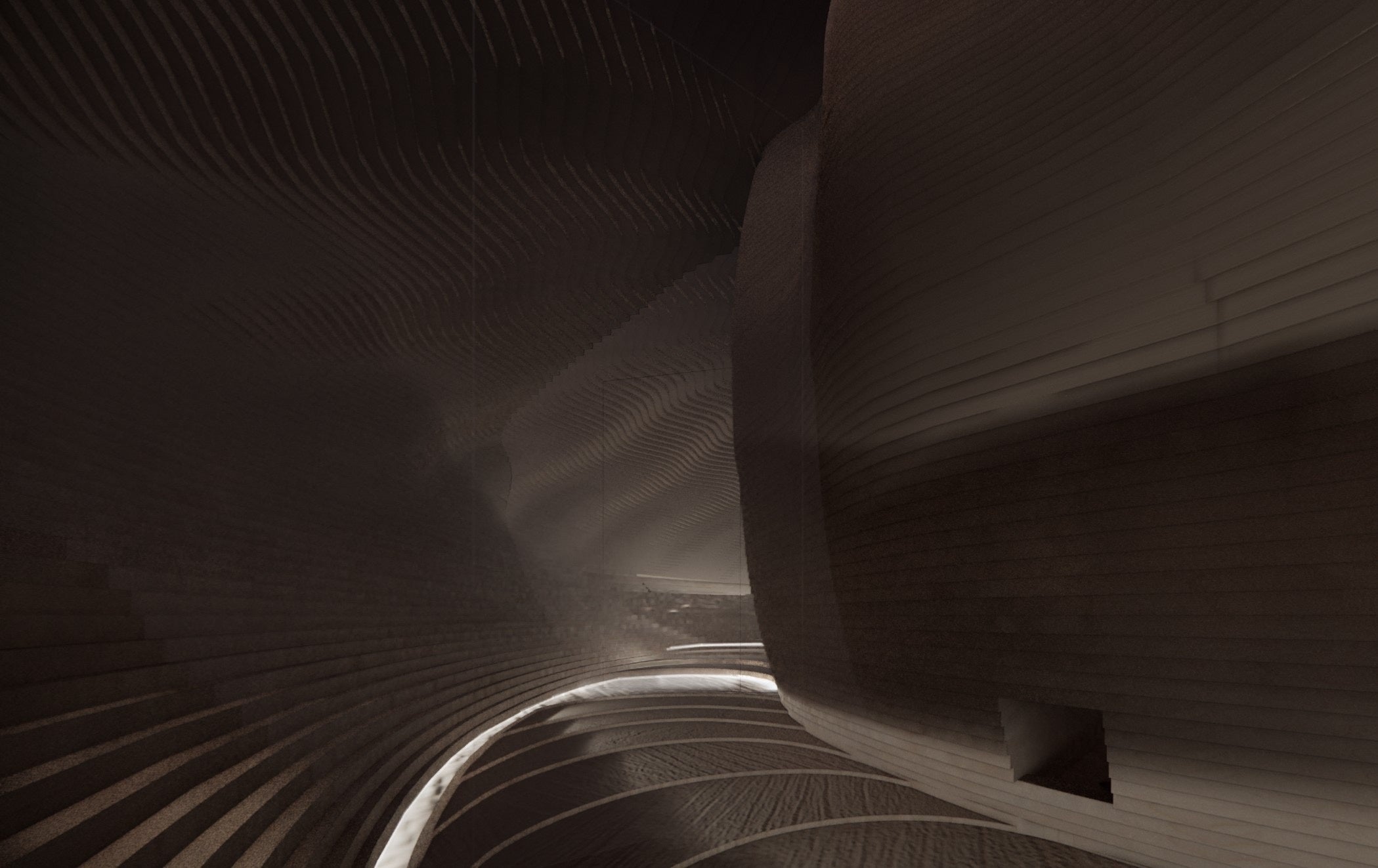 中へ入ると、曲線と曲面で構成された神秘的な空間が広がります。天に向かってゆったりと渦巻く壁面と、天辺に穴の空いた構造は、まさに貝殻の内部さながら。採光は空から差し込む光と足元の間接照明のみで、季節や時間帯によって変化する自然の光をお楽しみいただけます。