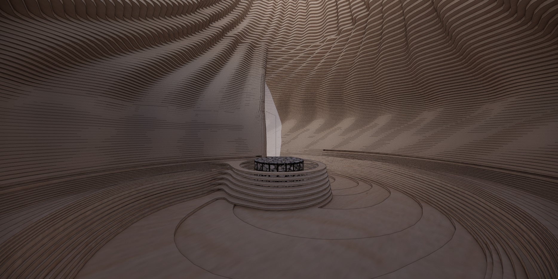 「鑑賞を前提としたものに使う、「体験型」という言葉が市民権を得て数年が経つ。アートの島として知られる、直島にも数多くの体験型の作品がある。しかし、その多くはあくまで非日常を体験するものにとどまっている。サウナはその本質として、じぶんと向き合う時間をくれる。「ととのい」という時間だ。『Sazae』は、サザエ(サのつく貝)の外殻に着想を得た、1000枚以上の合板を積層したサウナである。3D CADソフトを用い、熱環境、風環境のシミュレーションを行ったことで、最高の温熱と蒸気を体験できる。一見、その形態の特殊性、複雑性から、直島の他のアートと同様に、作家の表現としてのアートにみえるかもしれない。しかし、これは体験のその先、じぶんの内に向かい、そして、直島の自然をより深いレベル体験するための装置である。」