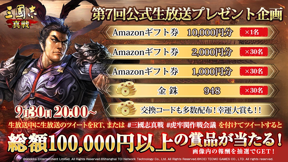 9月30日(金)20時の生放送を記念してプレゼント企画を開催します。応募方法は下記の通り。ハッシュタグ「#三國志真戦」「#虎牢関作戦会議」を付けてツイートするか、生放送関連のTweetをRTしていただくか、いずれも参加対象となります。抽選で総額10万円分のAmazonギフト券や金銖などプレゼントします。さらに放送中に多数の交換コードも配布!幸運大賞もあります!