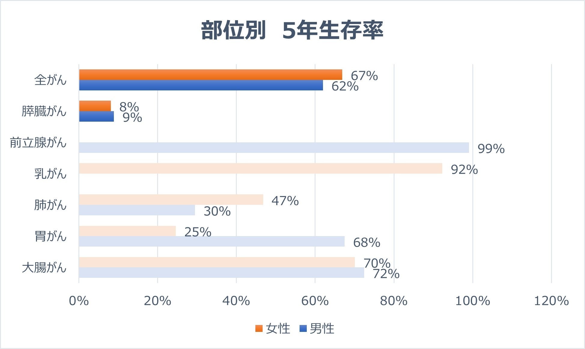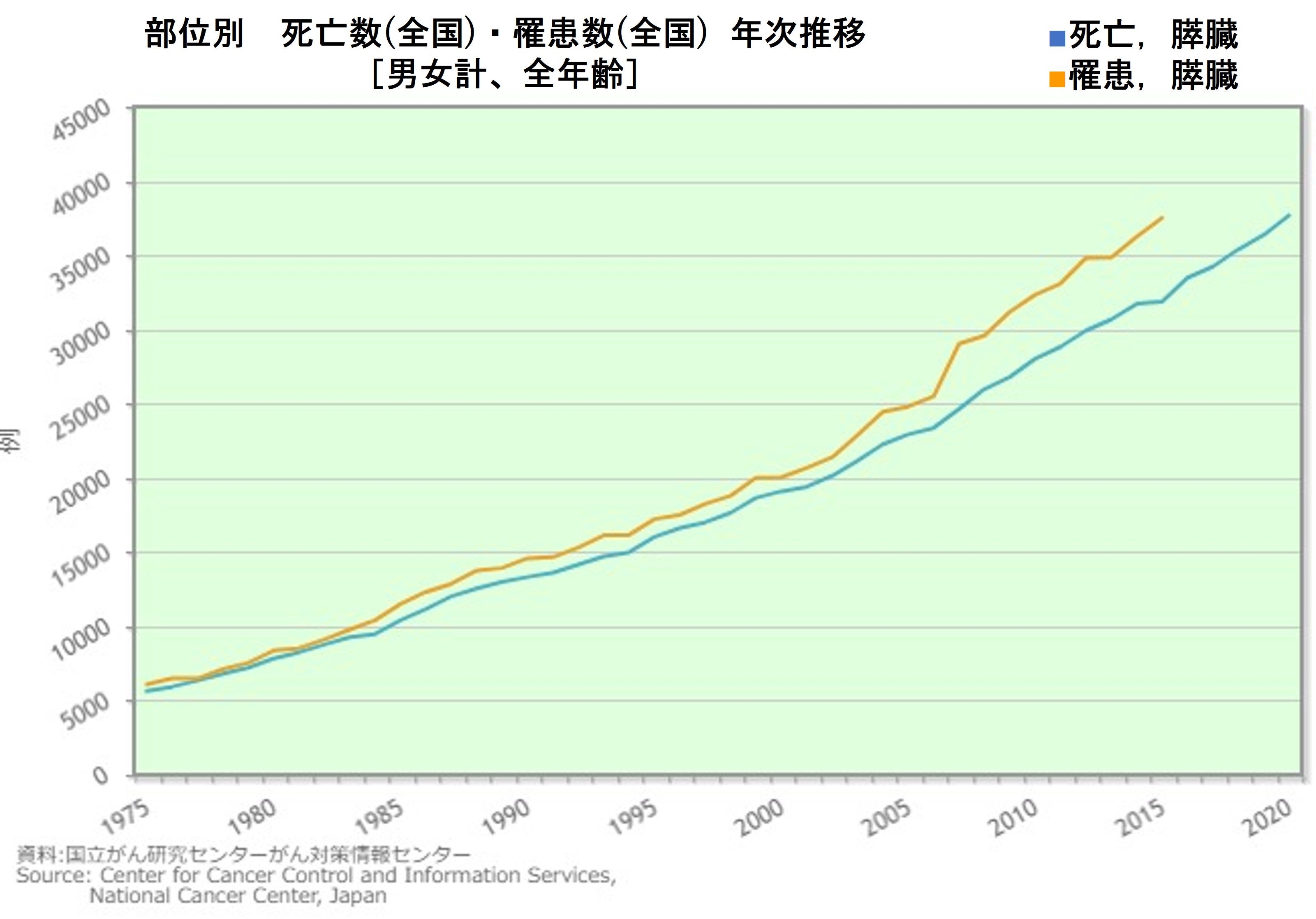 膵癌は最も予後不良の癌の一つで、全体の5年生存率は8.5%と報告されています(図1)。がん統計では膵癌による死亡数は女性で3位、男性で4位、年罹患数は42,361人、今後も更なる増加が予測されています(図2)。さらに、膵癌のリスク因子とされる膵嚢胞性疾患も増加しており、精査対象となる患者が増えています。